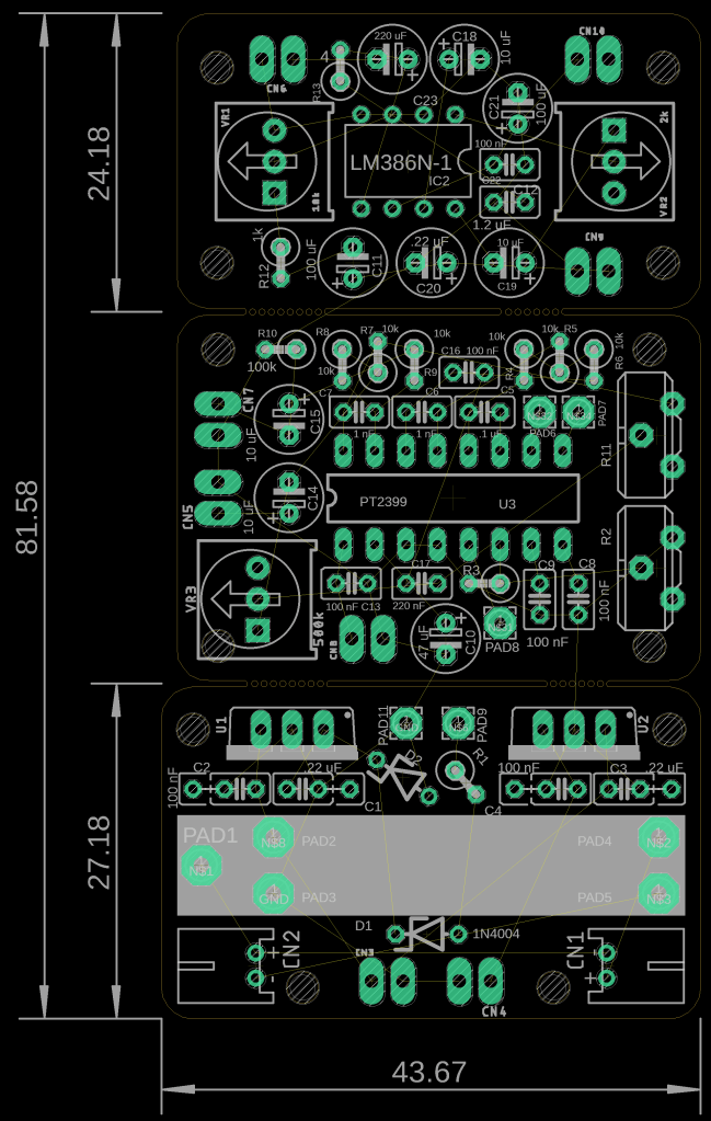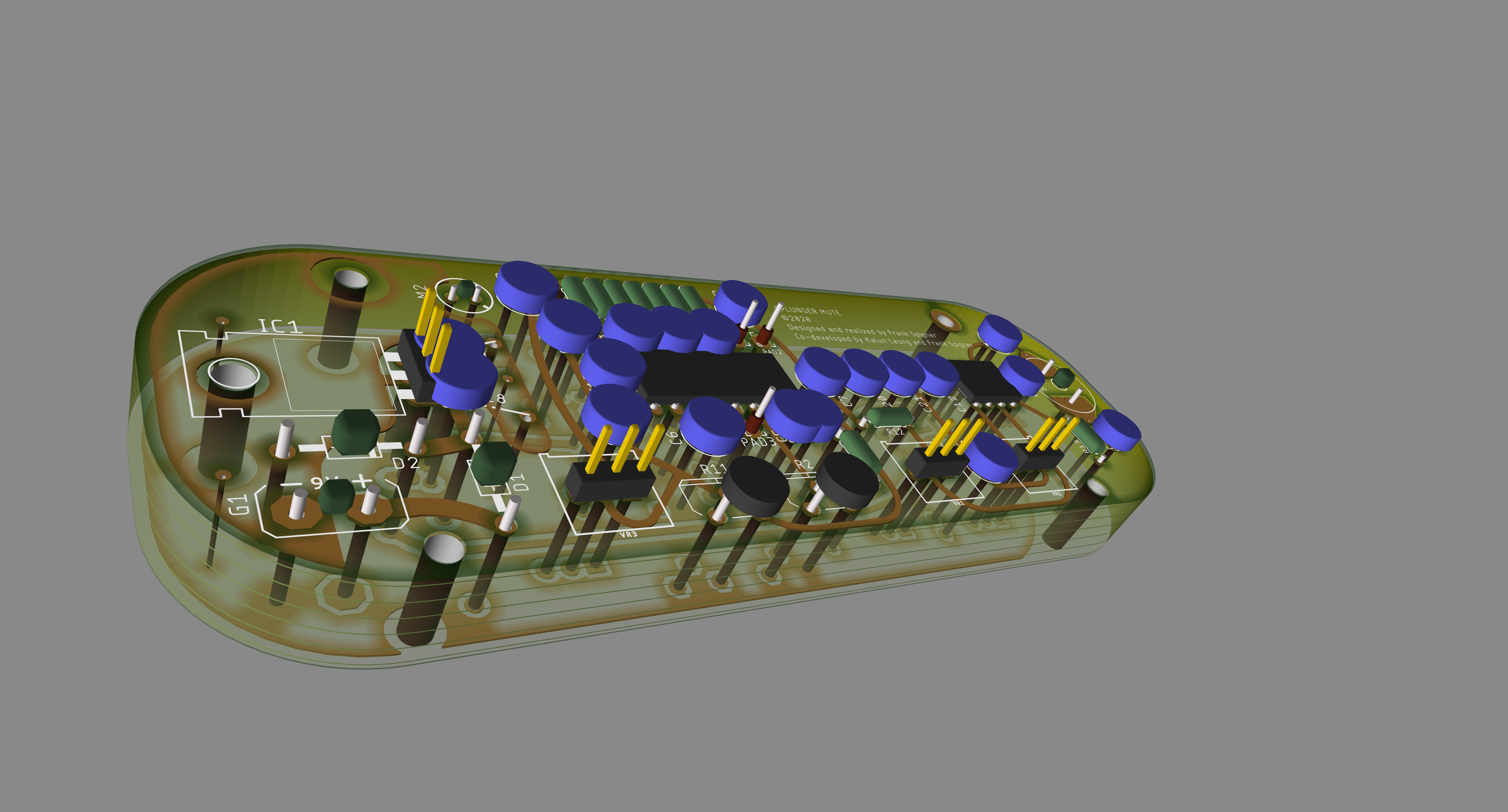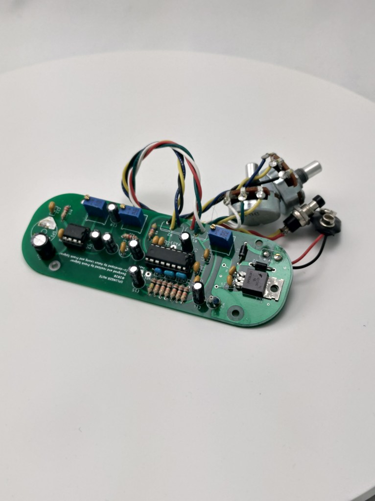 There is the sound manipulation component of the circuit which is based on feedback generation while manipulating it within the bell of the trombone. There is a dynamic microphone element, which feeds the main sound manipulation circuit, which is basically a delay and feedback line, with a very short delay time, to create a kind of ‘spectral feedback’ for lack of a better term. Then, there is a small power amplifier which amplifies the sound manipulation component, and then is output to an 8-ohm speaker. The speaker and speaker enclosure is designed so that the opening of the speaker, and speaker itself, can be manipulated with the hand to alter the sound being generated. There are various points on the circuit that are serviceable with trimpots and pin connectors to allow for calibration and customization at various points.