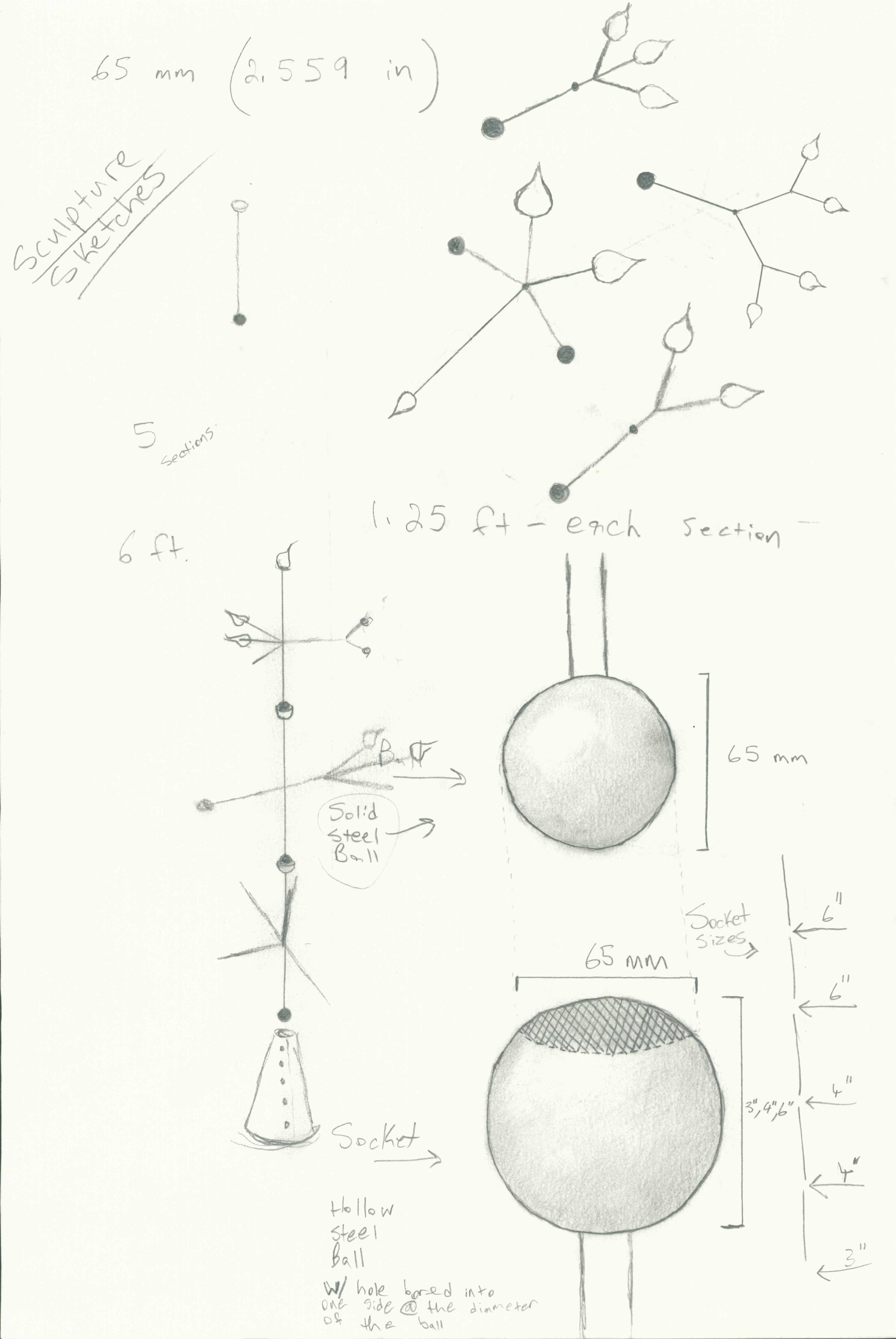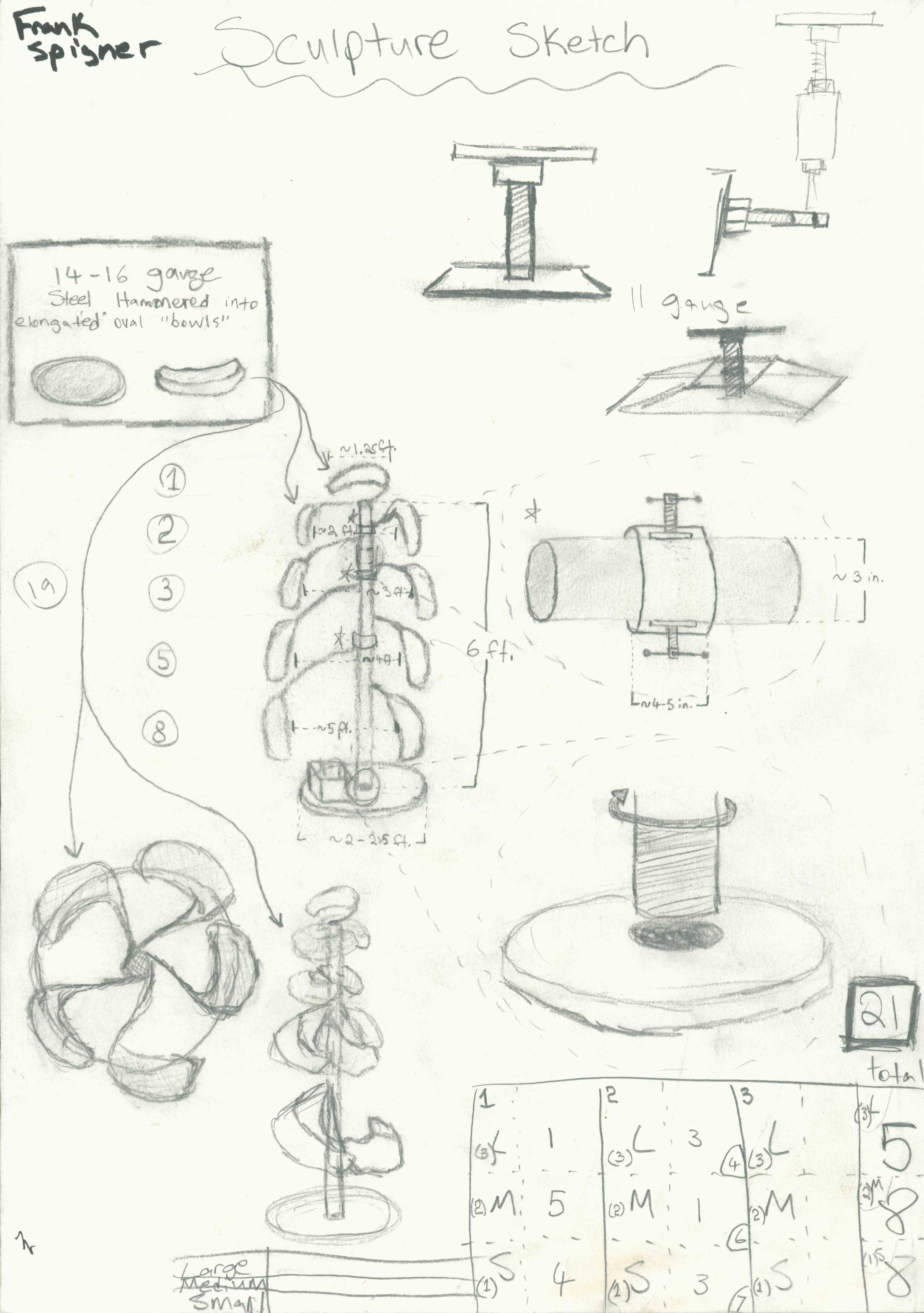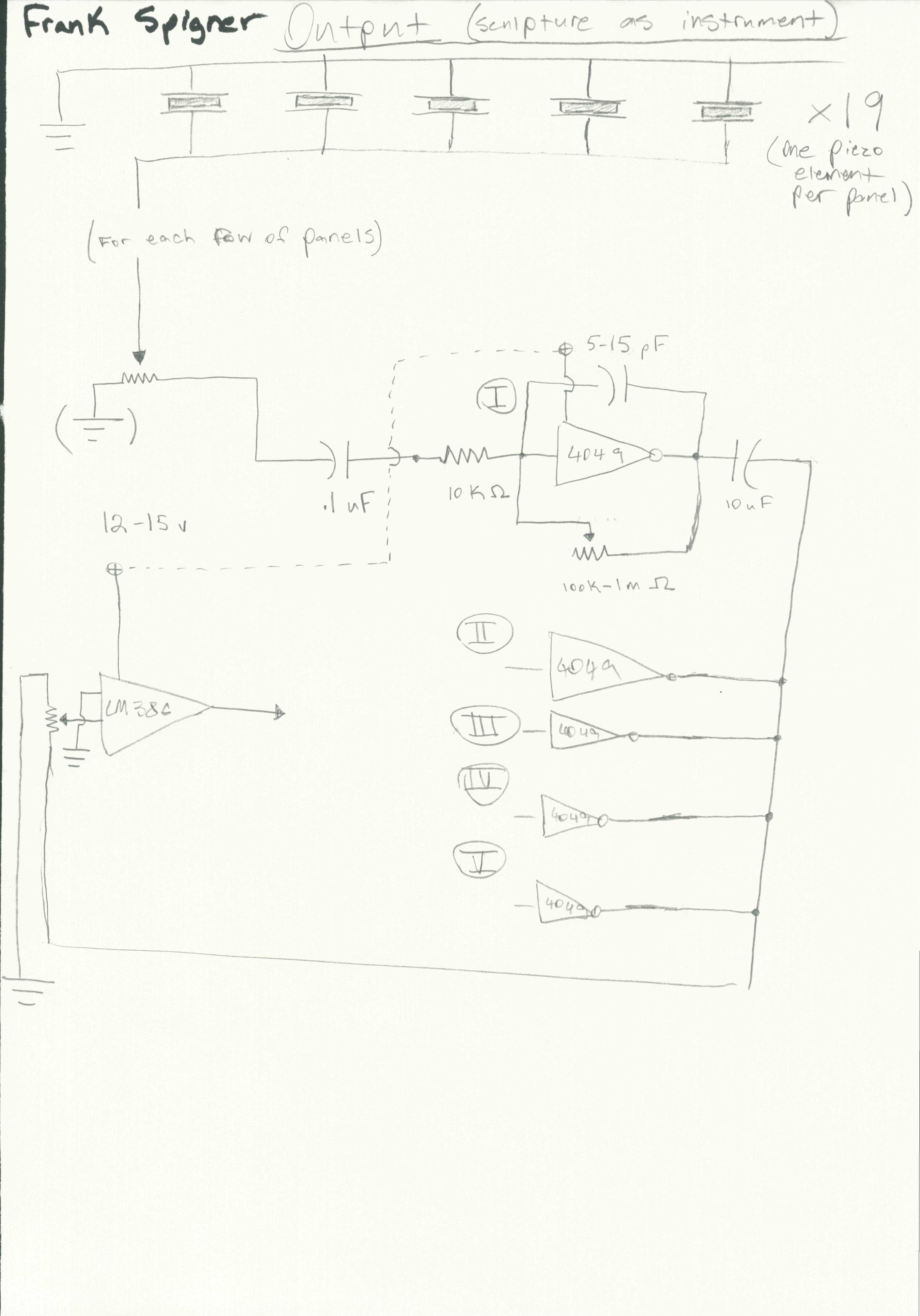 One of my current projects includes an eight foot tall interactive sound sculpture. It will be made entirely of mild steel except for the circuit design and electronic elements which will drive the sonic component. The sculpture will have resonant panels that will have piezo elements to convert the mechanical and acoustic vibrations into an electrical impulse that is processed and amplified. The sculpture will also have transducers that drive the sculpture to function as a physical filtering mechanism. This way, the input sound takes on the sonic qualities of the structure itself. The piece will also contain a circuit that produces frequency and timbre material based on the capacitance of whatever moves near it. This means that if the piece is being manipulated by musicians, performers, or the public, the varied body chemistries of these people will draw out different sonic qualities from the sculpture.