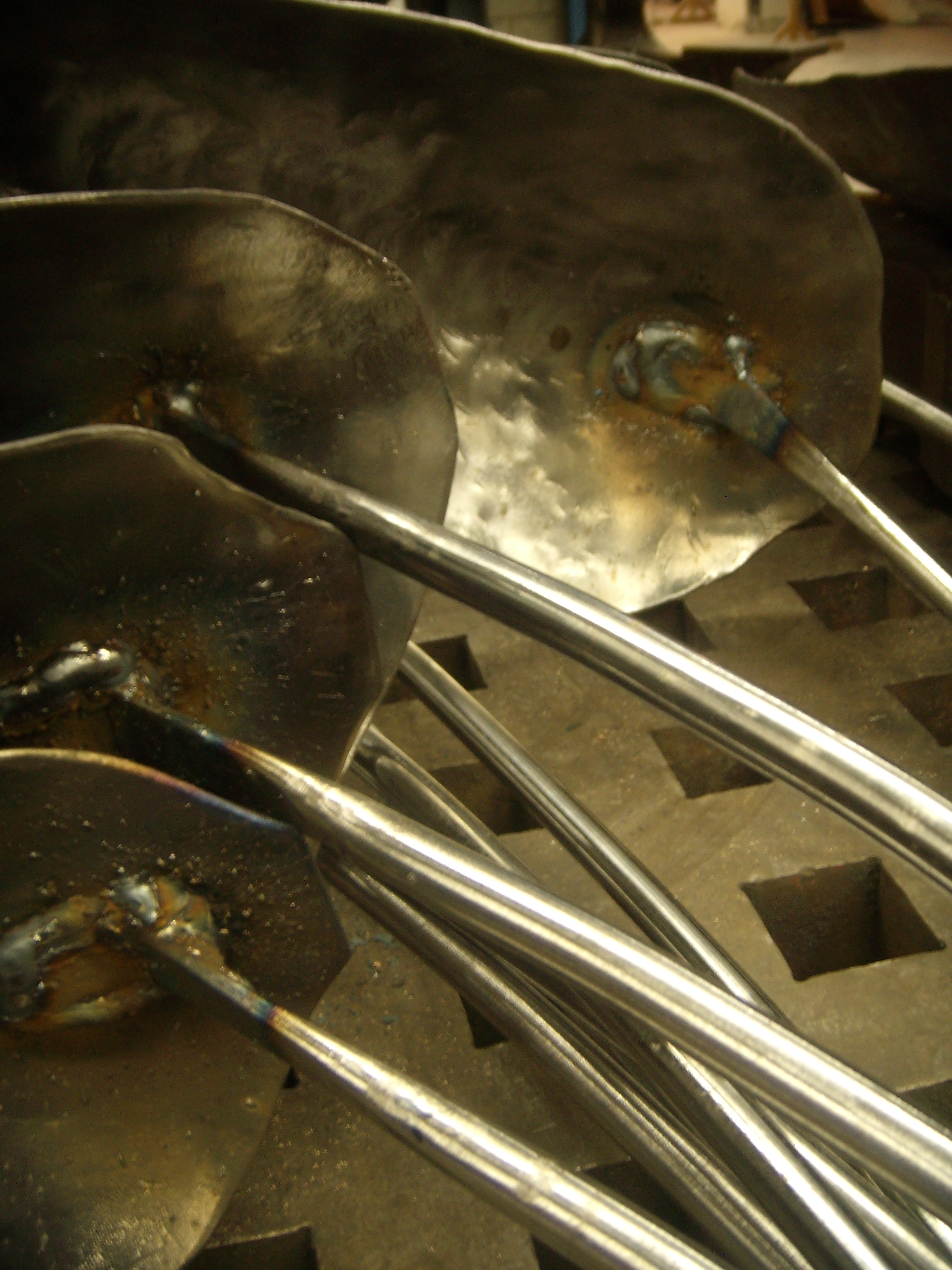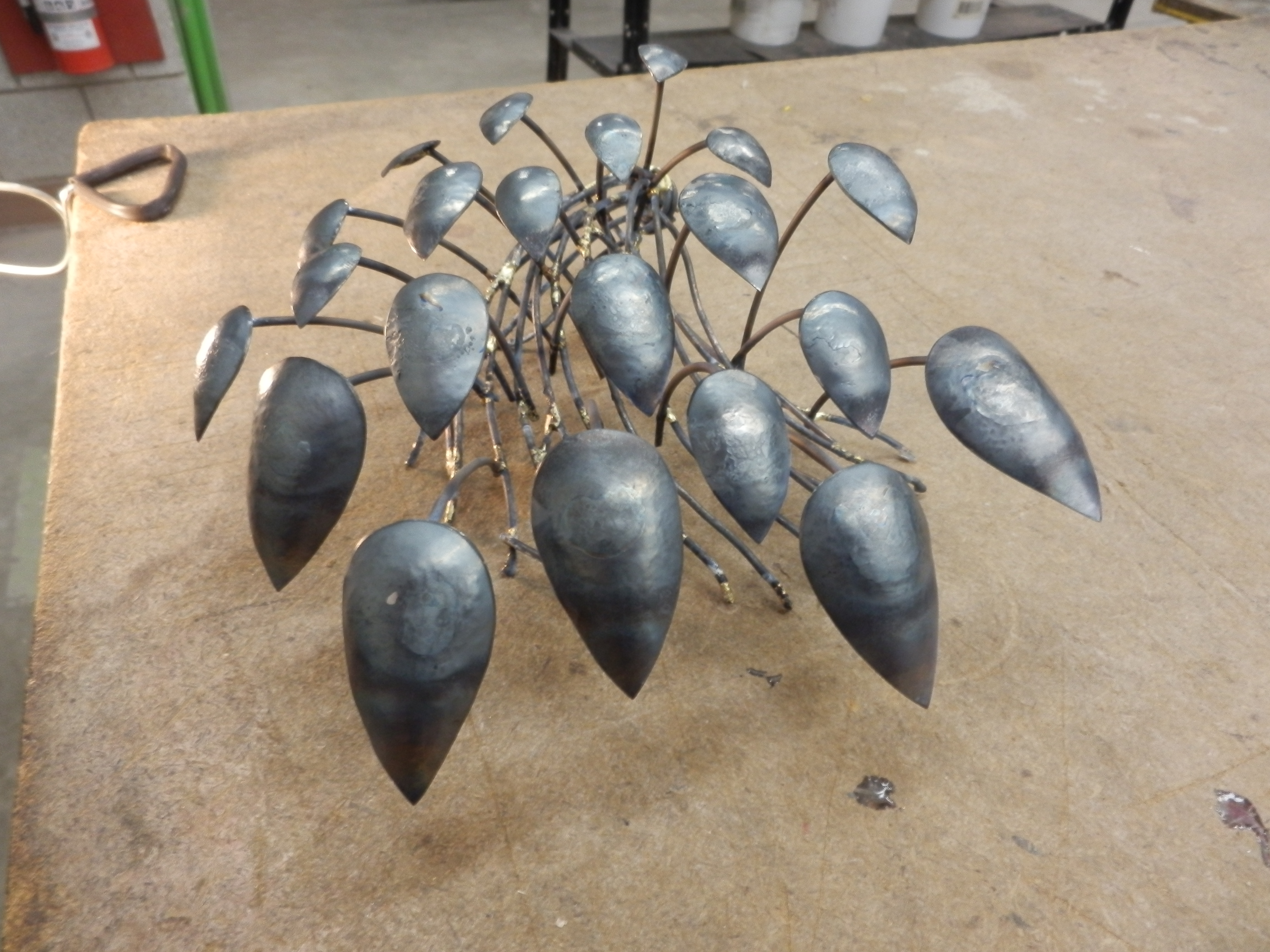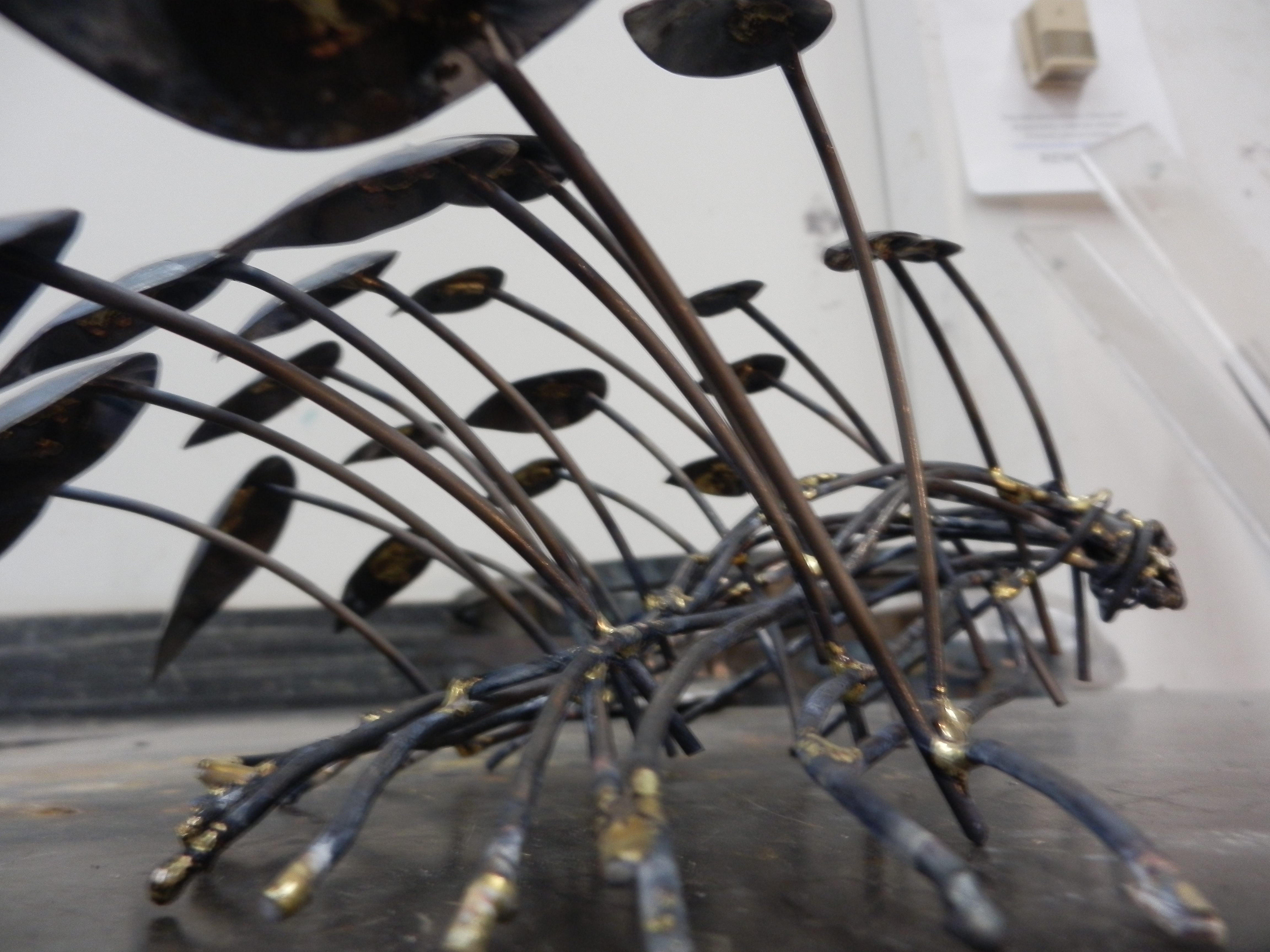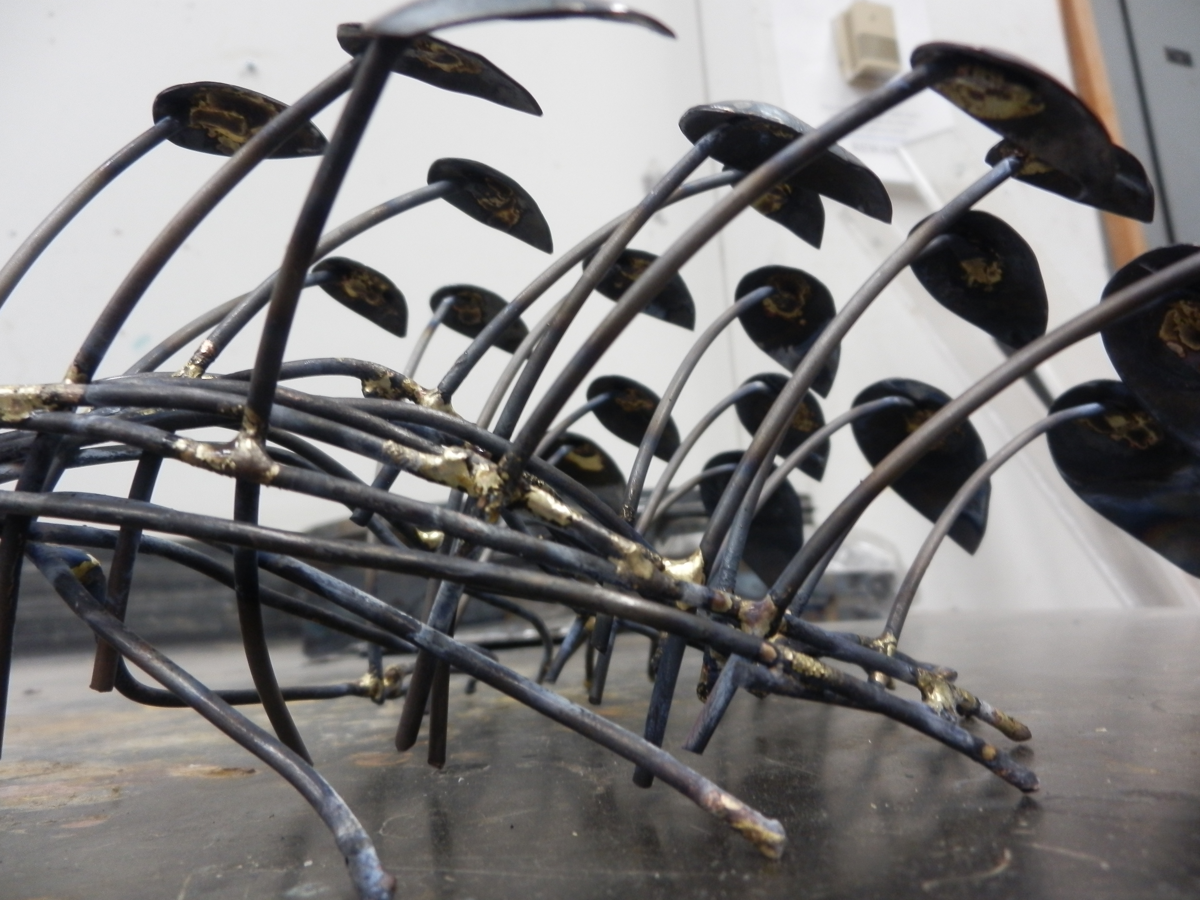 One of my current projects includes an eight foot tall interactive sound sculpture. It will be made entirely of mild steel except for the circuit design and electronic elements which will drive the sonic component. The sculpture will have resonant panels that will have piezo elements to convert the mechanical and acoustic vibrations into an electrical impulse that is processed and amplified. The sculpture will also have transducers that drive the sculpture to function as a physical filtering mechanism. This way, the input sound takes on the sonic qualities of the structure itself. The piece will also contain a circuit that produces frequency and timbre material based on the capacitance of whatever moves near it. This means that if the piece is being manipulated by musicians, performers, or the public, the varied body chemistries of these people will draw out different sonic qualities from the sculpture.